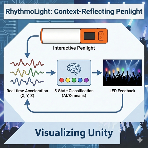本研究は,音楽ライブにおける観客の身体動作をリアルタイムに解析し,その状態を光として反映する双方向型ペンライトの設計と評価を行うものである。ペンライト操作時の加速度データから動作の強度・揺らぎ・ピーク性などの特徴量を抽出し,クラスタリングにより観客の盛り上がり状態を段階的に分類する手法を提案した。さらに,分類結果に基づきLEDの色を即時制御するシステムを実装し,観客同士や演者との一体感を高める新しいライブ体験の可能性を示した。