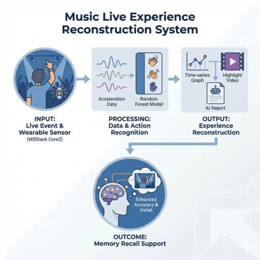 本研究は,音楽ライブ参加時の身体動作をウェアラブルデバイスで取得した加速度データから解析し,体験を想起しやすい形で再構成する手法を提案する。加速度信号から行動分類および運動強度・周期性といった特徴指標を抽出し,時系列可視化やハイライト生成,生成AIレポートとして提示するシステムを実装した。検証実験の結果,提案手法は時間経過後の記憶想起における正確性・詳細度の低下を抑制し,ライブ体験の振り返りを効果的に支援することが示された。